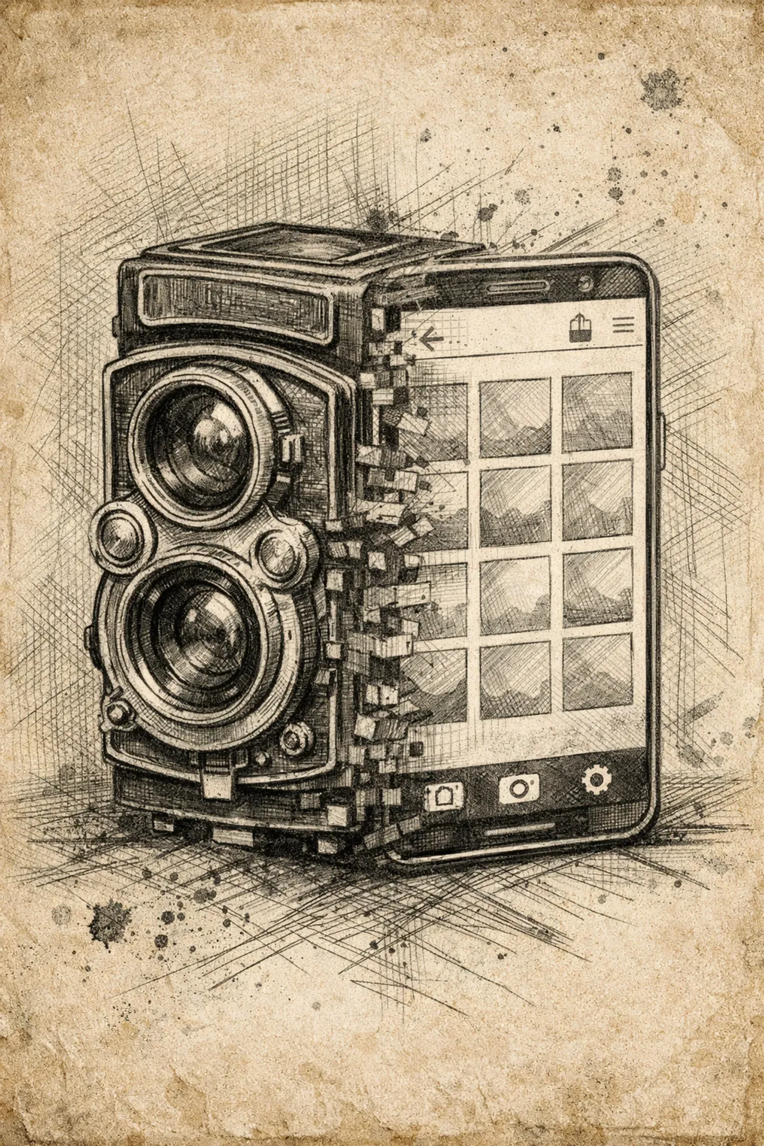 Visual: An old-school sketch of a vintage camera integrated into a modern smartphone interface, symbolizing the blend of classic artistry and new-age tech.
